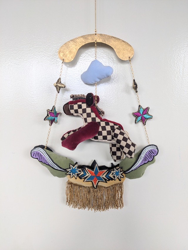 夜をかける小馬です。 どこかのメリーゴーランドから抜け出てきたようです。 # モビール ■サイズ: 横30cm x 縦cmくらい ★全て手作りのため、個体差があります。 ★写真の写りが、実物と色合いが異なる場合があります。ご了承ください。